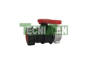 Válvula de bola con rosca macho+ junta PTFE+ palanca roja y tapón negro/rojo